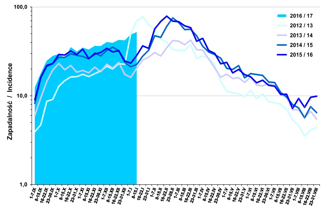 Zachorowania i podejrzenia zachorowań na grypę. Średnia dzienna zapadalność (na 100 tys. ludności) wg tygodniowych meldunków w sezonie 2016/17 w porównaniu z sezonami 2012/13 - 2015/16. Rys. pzh.gov.pl