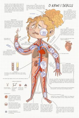 Drugi głos należy do dziecka, a więc do książkowej Klary. Pojawia się pod postacią swobodnych dopisków i zabawnych szkiców uzupełniających dziadkowe wykłady anatomiczne. Zawadiacko przepychając się pomiędzy nimi, nadaje tej książeczce lekkości i przystępności. Tak więc pomiędzy notkami o prawidłowym nawodnieniu i typach komórek w ludzkim organizmie czai się dopisek o dziurawych rękach, nogach z waty i motylach w brzuchu, a obok fragmentu o mięśniach dostrzeżemy dodany „odręcznie” do schematu anatomicznego… puszkowy generator zakwasów. Jest też sporo informacji praktycznych, a więc np. obok ustępu na temat pracy serca znajdzie się omówienie tego, czym jest guz na głowie czy skąd biorą się rumieńce. Taka formuła mi się podoba, bo rozluźnia sztywny przekaz, daje nieco oddechu w strumieniu podawanej wiedzy.