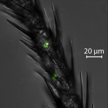 Zdjęcie pokazujące nogę muszki owocówki, na której przenoszone są drożdże. Fot. Joaquin F. Christiaens i inni