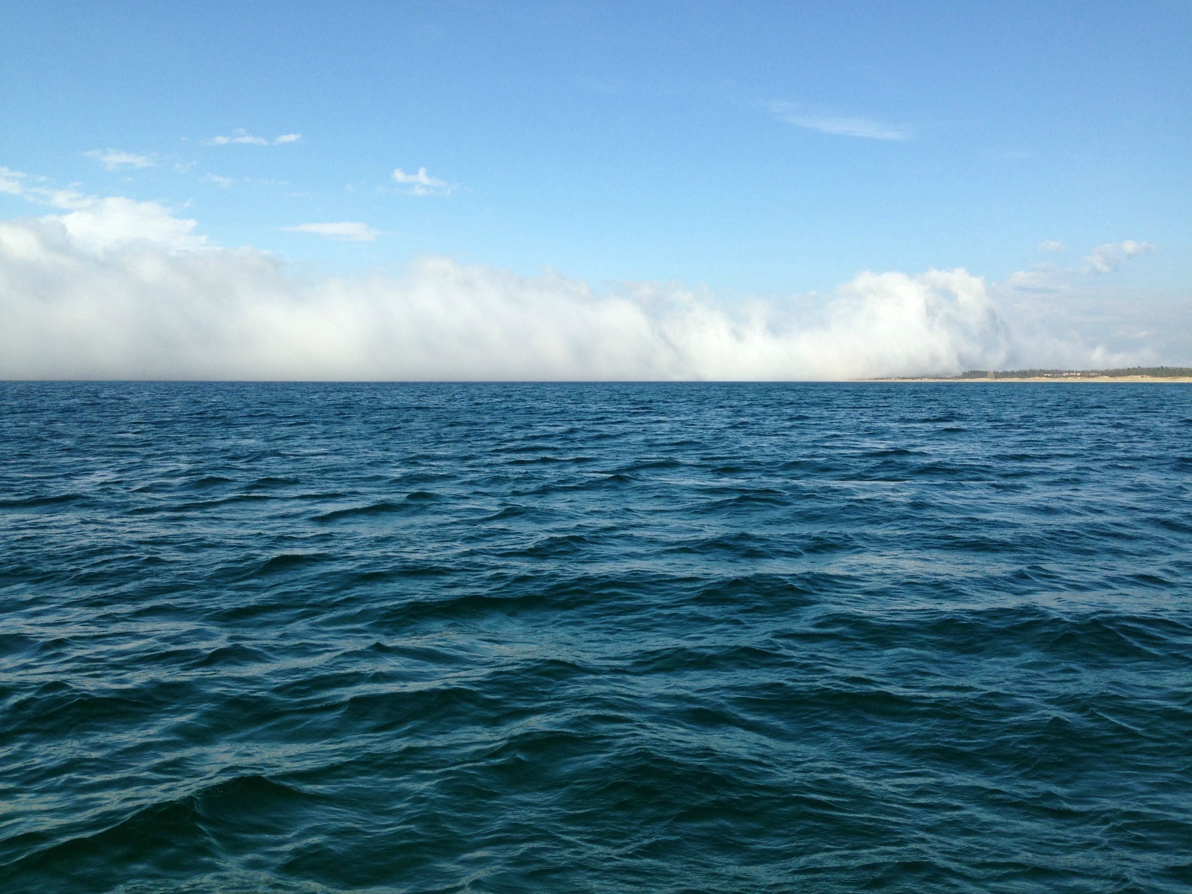 Co wywołało tę dziwną mgłę (bo mgła to nic innego jak chmura dotykająca podstawą ziemi)? Nosi ona nazwę mgły adwekcyjnej, która powstaje wtedy, kiedy ciepłe, wilgotne masy powietrza napływają nad chłodniejsze podłoże. Wówczas powietrze gwałtownie oziębia się, osiągając temperaturę punktu rosy, co inicjuje tworzenie się mgły. Tę, którą zobaczyli Ballardowie, uchwycił satelita NOAA na poniższym zdjęciu.