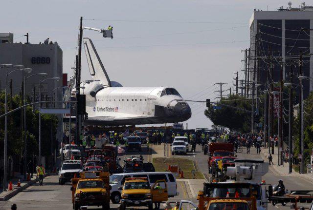 Endeavour pokonał ostatnią przeszkodę w swojej karierze: wąski most nad autostradą stanową 405 w Los Angeles, w drodze z lotniska do muzeum. Jechał na platformie wyposażonej w 160 kół, w asyście tłumów.