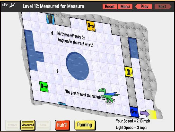 W uproszczeniu musimy pokonać pewnym dinozaurem trasę z jednego na drugi koniec planszy. Ale szybko pojawiają się efekty relatywistyczne – zniekształcenie przestrzeni, zmiana upływu czasu itp. W trakcie gry dowiadujemy się o kolejnych zjawiskach, a w każdej chwili możemy przeskoczyć do ich bardziej szczegółowego opisu. Jest co prawda po angielsku, ale całość napisana jest całkiem łatwo i przystępnie.