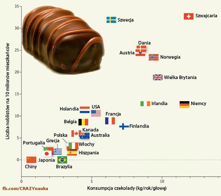 Postanowił zestawić liczbę nagród Nobla (proporcjonalnie do liczby ludności kraju) ze spożyciem czekolady na głowę. I co mu wyszło? Piękna korelacja! W małej Szwajcarii gdzie je się mnóstwo czekolady na 10 mln obywateli przypada ponad 31,5 noblisty (to statystyka, bo Szwajcaria ma ok. 8 mln mieszkańców). Z kolei w Chinach, gdzie je się czekolady niewiele na 10 mln ludzi jest ledwo 0,03 noblisty. Polska lokuje się niższej strefie stanów średnich z 1,3 noblisty. Ewenementem jest Szwecja, gdzie je się mało czekolady, a za to Noblistów jest więcej niż w Szwajcarii (zaraz, zaraz – gdzie oni te nagrody przyznają?).