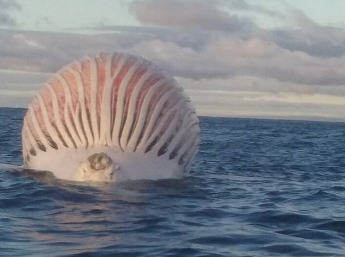 – napisał Watkins na Facebooku. Okazało się, że przedziwnie wyglądającym obiektem są wzdęte zwłoki humbaka (długopłetwiec oceaniczny).