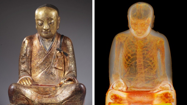 Dzięki tomografii komputerowej odkryto, że wewnątrz posągu znajduje się mumia. Od 1000 lat tkwi w pozycji kwiatu lotosu…