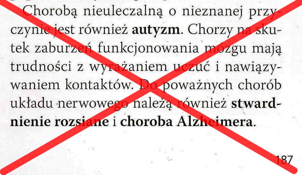 Dlatego niezwykle istotne jest przekazywanie uczniom prawdziwych informacji w prosty, jasny sposób, bez powielania krzywdzących stereotypów. Nazwanie autyzmu chorobą to błąd merytoryczny, który w języku potocznym czy w artykule na plotkarskim portalu tylko irytuje, ale w podręczniku do biologii jest po prostu skandalem. Zestawianie autyzmu w jednym akapicie z chorobami neurodegeneracyjnymi jest nie tylko mylące, ale też może przyczynić się do dalszej stygmatyzacji dzieci z ASD. Osoby odpowiedzialne za dopuszczenie tego podręcznika do użytku szkolnego chyba nie zastanowiły się nad tym, że uczyć się z niego będą dzieci z autyzmem, razem ze swoimi neurotypowymi kolegami i koleżankami z klasy. A potem wyjdą na przerwę…