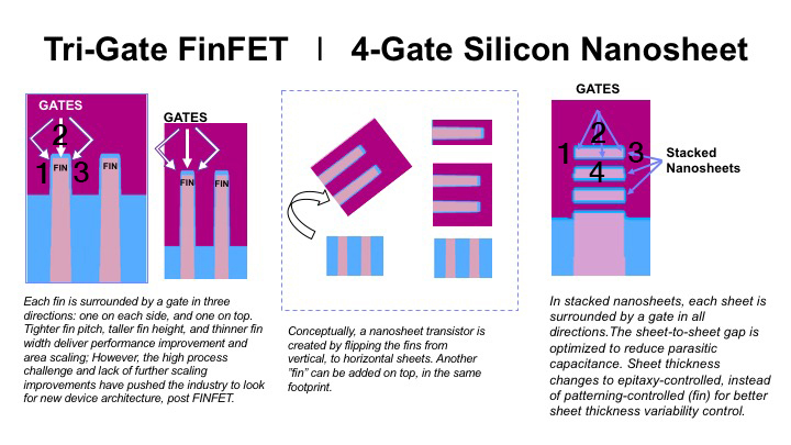 IBM wpadł na pomysł, by ponownie uczynić tranzystor płaskim. Pionowe żebra od pewnego momentu już nie mogą być ani węższe, ani wyższe, bo mogłyby się przechylić, jak trawa i się zetknąć. Dlatego pionowe kanały ponownie zotały ułożone horyzontalnie i otoczony bramką. by zapewnić im maksymalną wydajność. Tak powstał GAAFET czyli Gate All Around FET.