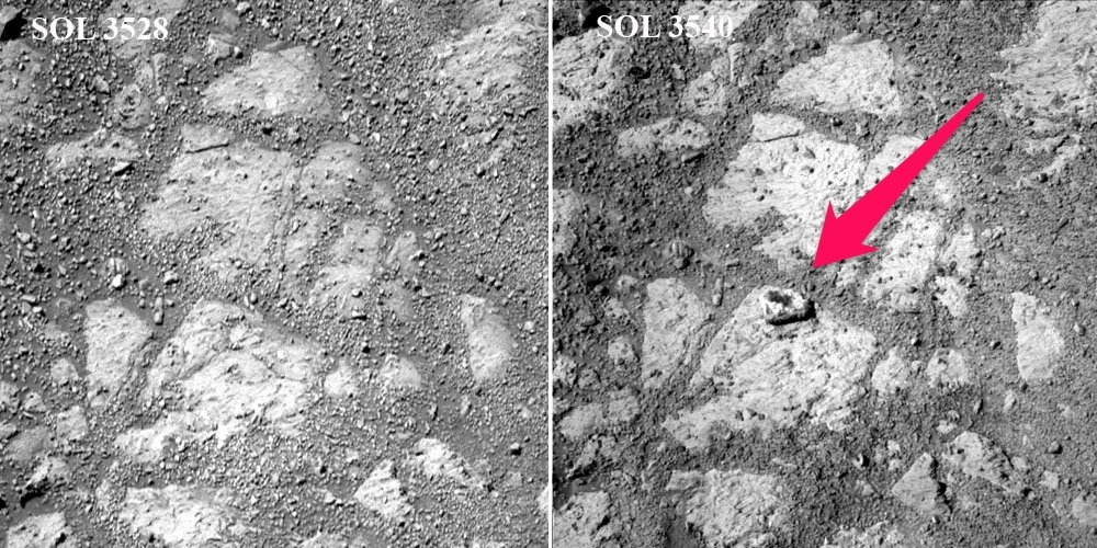 Widać to dobrze na zdjęciach – to po lewej przedstawia to samo miejsce w 3528. dobie misji, to po prawej – w dobie 3540. Wyraźnie widoczny jest kamień średnicy około 10 cm, który w tajemniczy sposób pojawił się koło łazika.