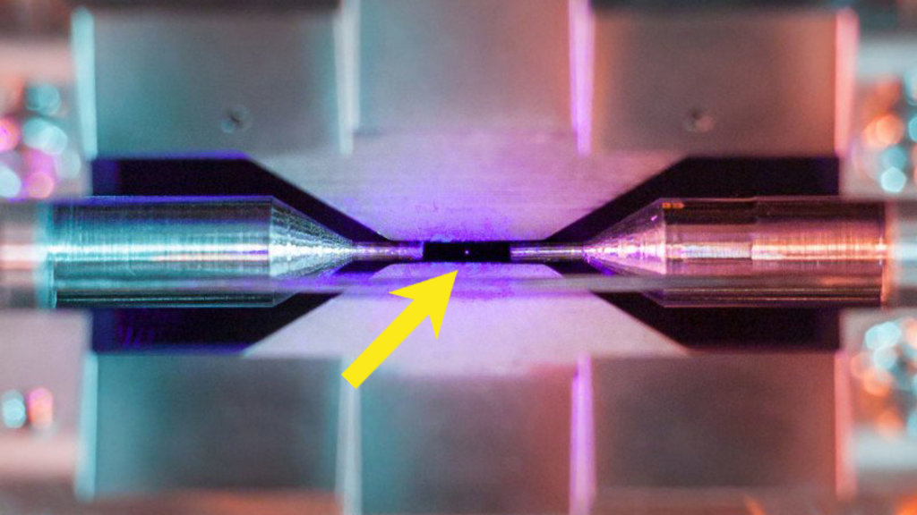Pojedynczy atom strontu w pułapce jonowej. Fot. David Nadlinger