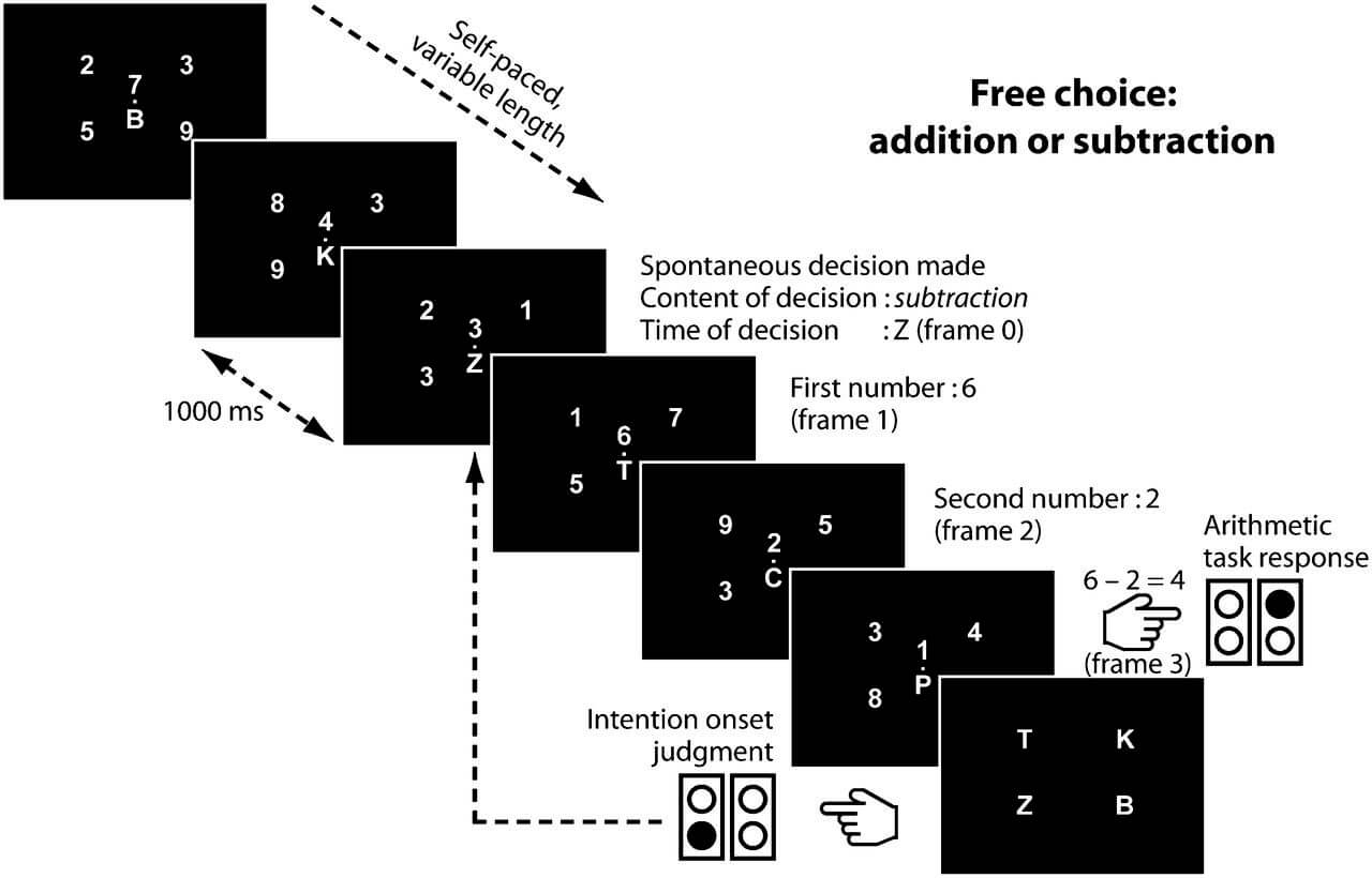 Głównym zadaniem uczestników było podjęcie abstrakcyjnej decyzji dotyczącej operacji matematycznej, którą chcieli wykonać – dodawania lub odejmowania – a następnie wykonanie jej na dwóch kolejno wyświetlanych na środku ekranu cyfrach. Dodatkowo, badani mieli zapamiętać, którą literę widzieli w momencie podjęcia decyzji – dzięki temu zespół naukowców mógł określić czas świadomego wyboru z dokładnością jednej sekundy (co wynikało z sekundowego interwału pomiędzy kolejnymi ekranami). Ostatnim zadaniem było wskazanie właściwego wyniku poprzez naciśnięcie przycisku odpowiadającego jednej z czterech cyfr wyświetlanych po bokach ostatniego ekranu.